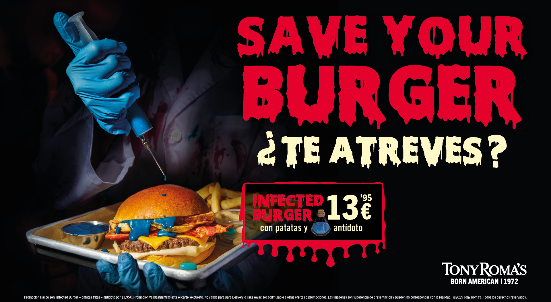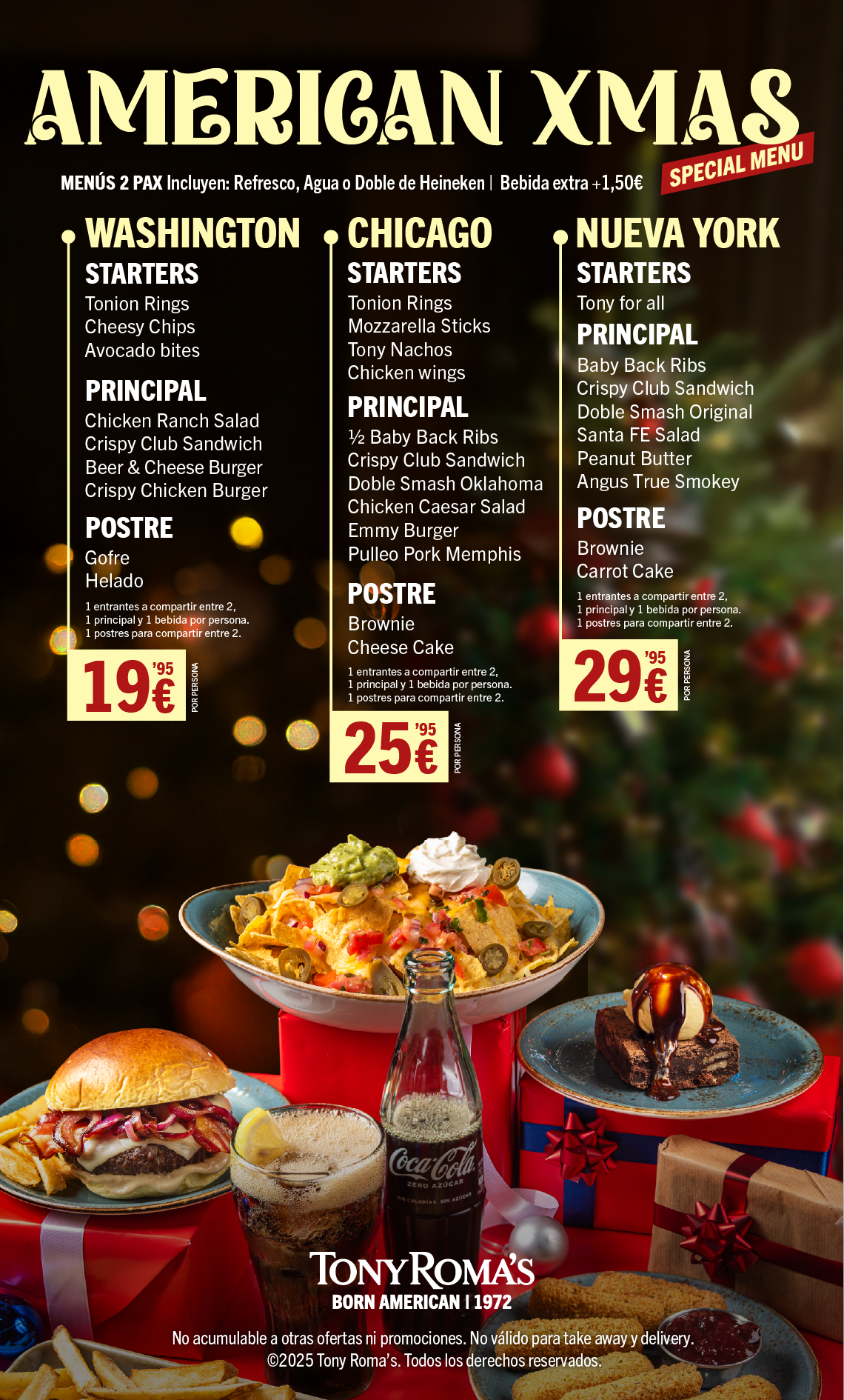 Nuevo Tony Meal válido de lunes a viernes laborables de 13h a 16:30h y no válido ni festivos ni vísperas de festivo. Cuatro opciones disponibles. Todos los platos incluyen una bebida a elegir entre: agua, refresco, o doble cerveza Heineken. Precio válido en TR que esté expuesto el material publicitario. Las fotos pueden no corresponder con la realidad. Promoción no acumulable a otras promociones. Válido en los restaurantes Tony Roma’s de Madrid adheridos a esta promoción: Gran Vía 68, Numancia 2, Orense 34, Silvano 92, Móstoles, Alcorcón Sur, Majadahonda y los Centros Comerciales Diversia, Plaza Norte 2, Parque Rivas, Xanadú, Islazul, Nexum, Tres Cantos, Torrejón, Torre Sevilla, Vistahermosa, Thader y Bahía Plaza.